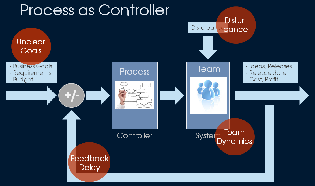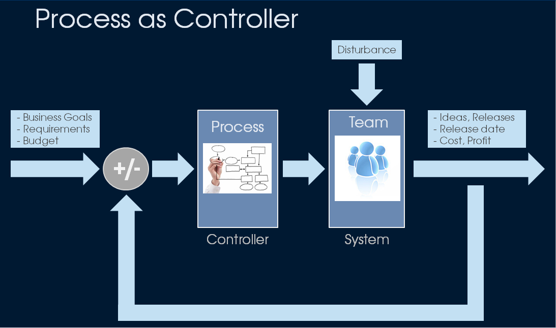 On the left side are the goals which are given to a team, e.g. business goals, requirements to a software system, available budget, timeline, etc. These goals can be considered as set values in a controller system and are the input to the controller which are the processes in the organisation. The controller transforms these set values into control values which is done by the process rules, e.g. requirements analysis, work package breakdown, work item creation, workflow, risk list, quality gates, reportings, releases. These control values are the input to the system to be controlled which is the team in our case. And the system produces the outputs which are ideas or concepts in case of a creative or research team, releases, dates, profits. These outputs are the actual values in the controller system. In each controller system the is always a feedback loop, i.e. the actual value is measured, subtracted from the set value and this control deviation is again the input to the controller.