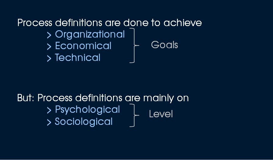 - The goals which are intended with processes are of organisational, economical and technical level