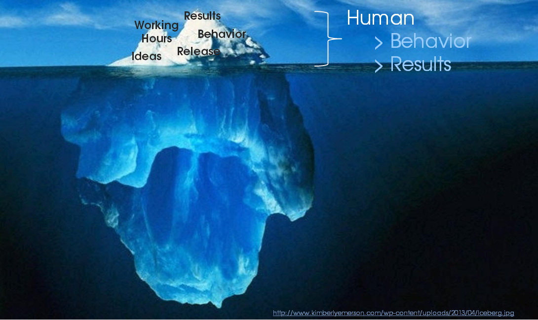 But to do so, it is necessary to deal with the human behavior and what is relevant for it, this means to look under the water surface which brings us back to the iceberg. From outside we can easily see how people behave, what they say, see their results they produce and the working hours they spent in office: