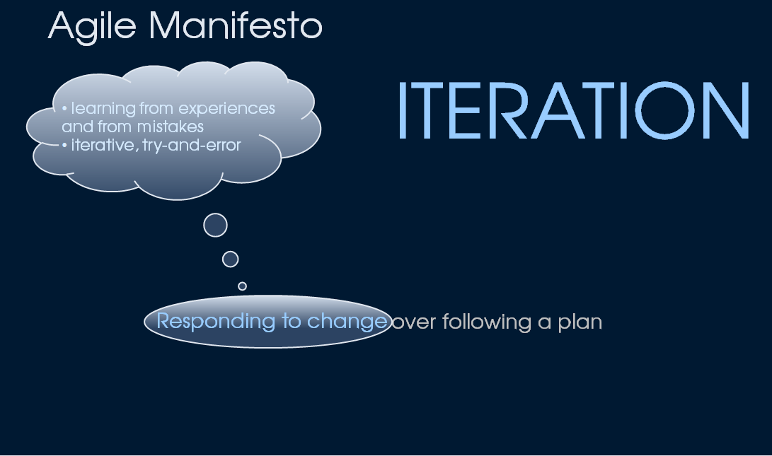 This means, reacting to changes is more important than keeping dogmatic to a plan that is outdated. The psychology related explanation to this is that people are an iterative being, and „try-and-error“ is nothing condemnable, but it simply reflects the human nature. And because it is important to make experiences and finally the humans have the ability to react to changed constraints, otherwise we could not even survive. The mechanism to react to changes is recursion and iteration. Iteration is nothing being invented by Agile Manifesto, it is as old as the humans are. The agile processes just discovered this principle again.