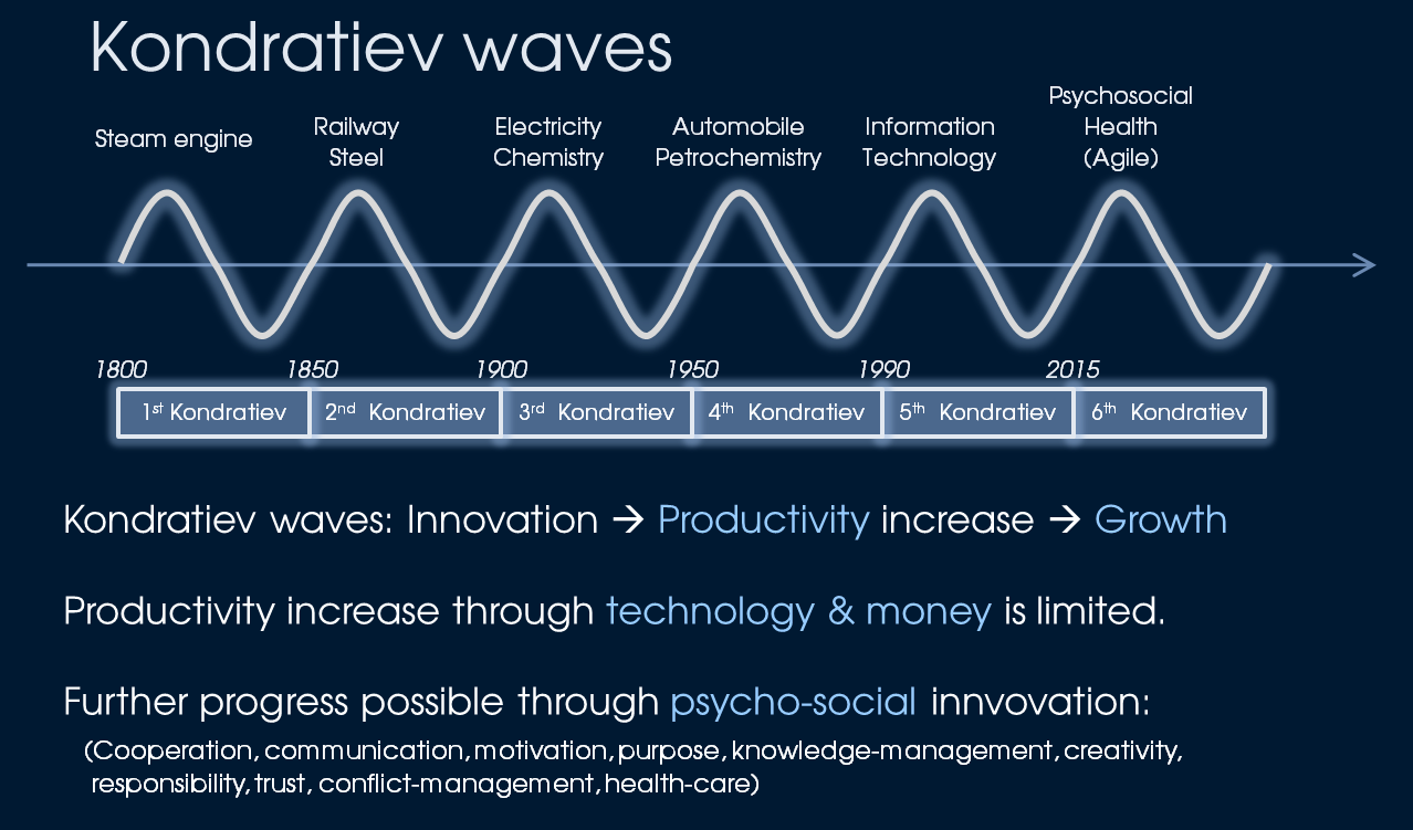 The shortage in our modern working environment is that we are very inefficient with information in our systems, teams, departments, organisations. Frankly speaking the inter-human information exchange is as bad as the transport effort before the invention of the railway. And now we are coming back to our process topic, since with the right processes we can solve this shortage. Therefore the thesis is that the productivity increase in the 6th Kondratiev wave will be fed by psycho-social innovations in the area of cooperations in and between teams. This includes cooperation and communication skills, trust, responsibility and conflict management.