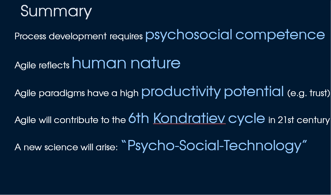 We have learned that the process development requires more psycho-social skills and less technical skills. Then the agile approaches are only the beginning of such a development. These new processes address the current lack in our organisations, i.e. efficient interpersonal information exchange. This improved social behavior leads to productivity increase and to a growth motor. And this growth will contribute to the 6th Kondratiev wave. Finally we can assume that this psycho-social innovation will be guided and levered by massive technological support. Due to this I am postulating the emergence of a new science that will combine sociological and technological sciences which we can call Psycho-Social-Technology.