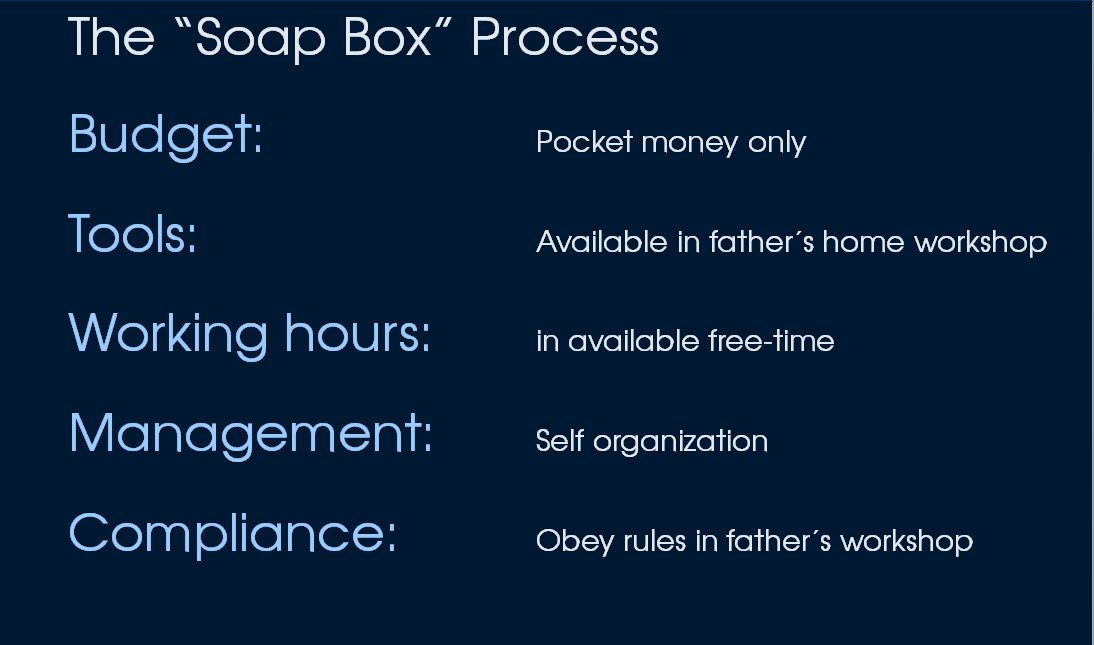 The budget was simply limited by the available pocket money. The toolbox available for the construction was my father´s home workshop on the farm (I am a farm boy). In terms of working time I was free, but I was not allowed to work on the soap box during school lessons, homework hours and the duties I had to do on the farm. But in terms of project management I was completely free to organize myself. Finally I had to take care of some compliance topics like the rules in my father´s workshop.