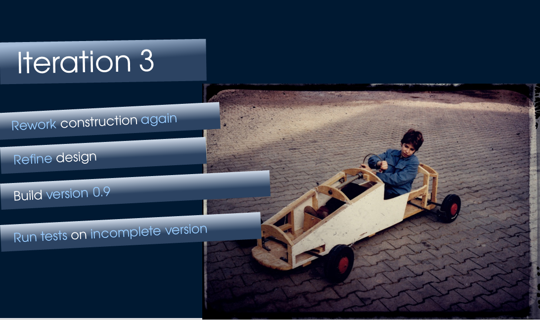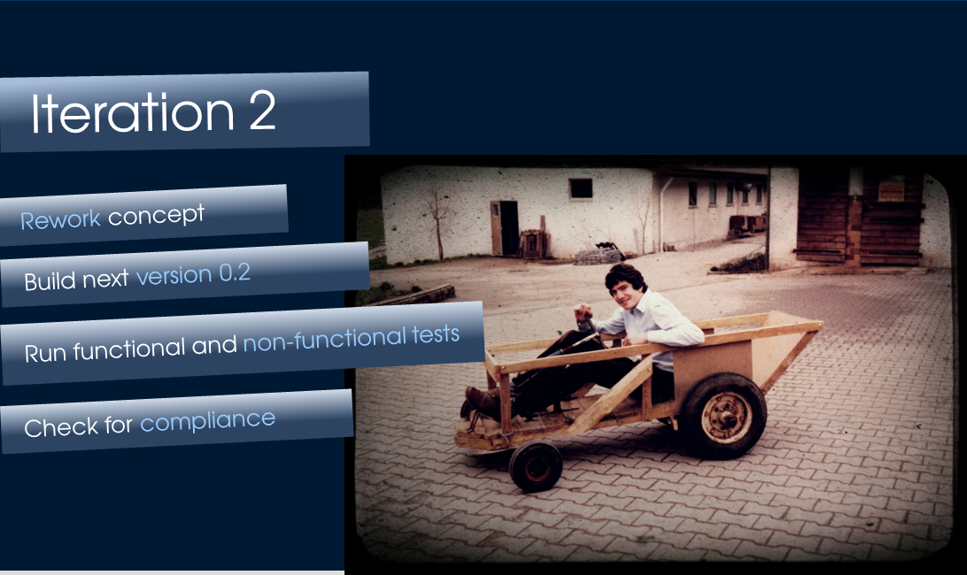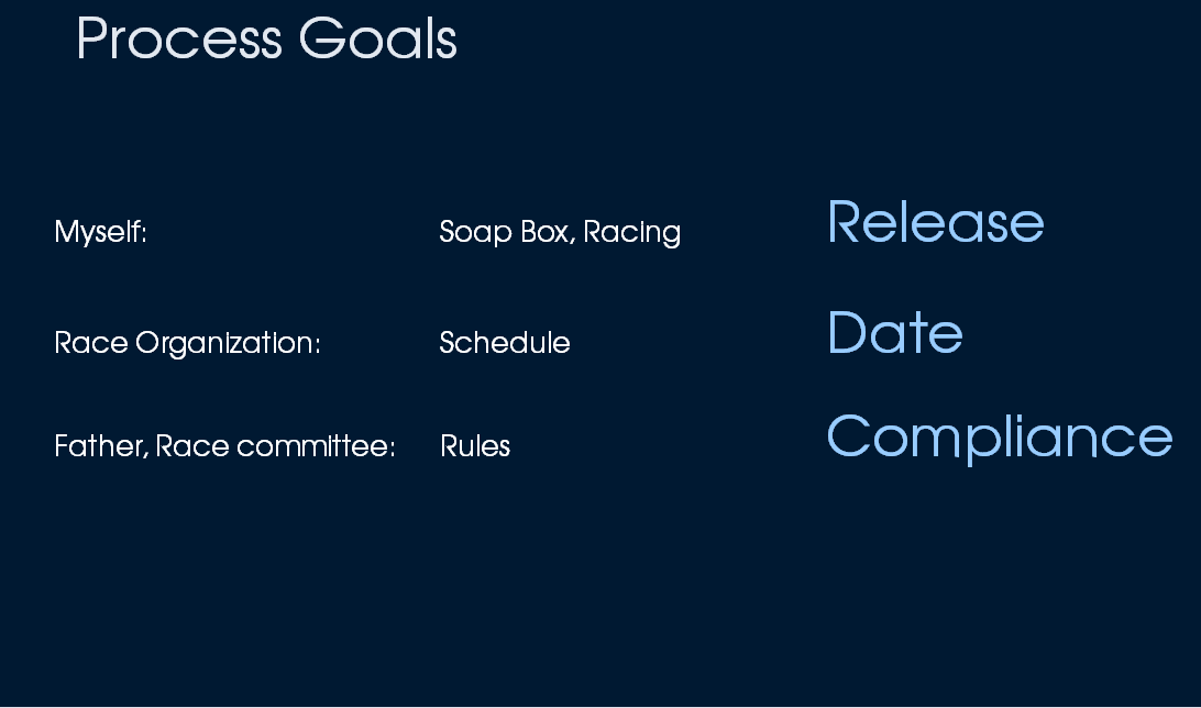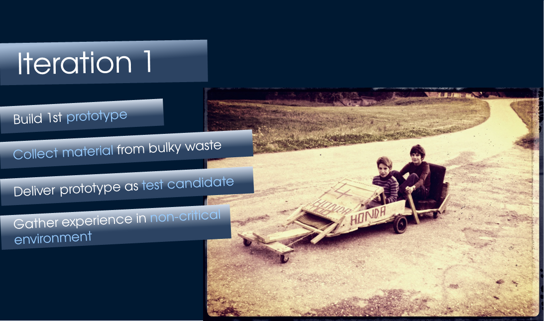 Why I am telling this story? The reason is that it shows in the centre of each project, each undertaking are first of all the involved people. In my soap box project it was me, my brother and friends who helped me building the car. But also my father who gave me quite much freedom, but still controlled the compliance of some rules. Within that constraints I was free in my working model or methods. But I also defined a framework for myself which can be considered as kind of a process that supported my to reach my goals. And these goals were: